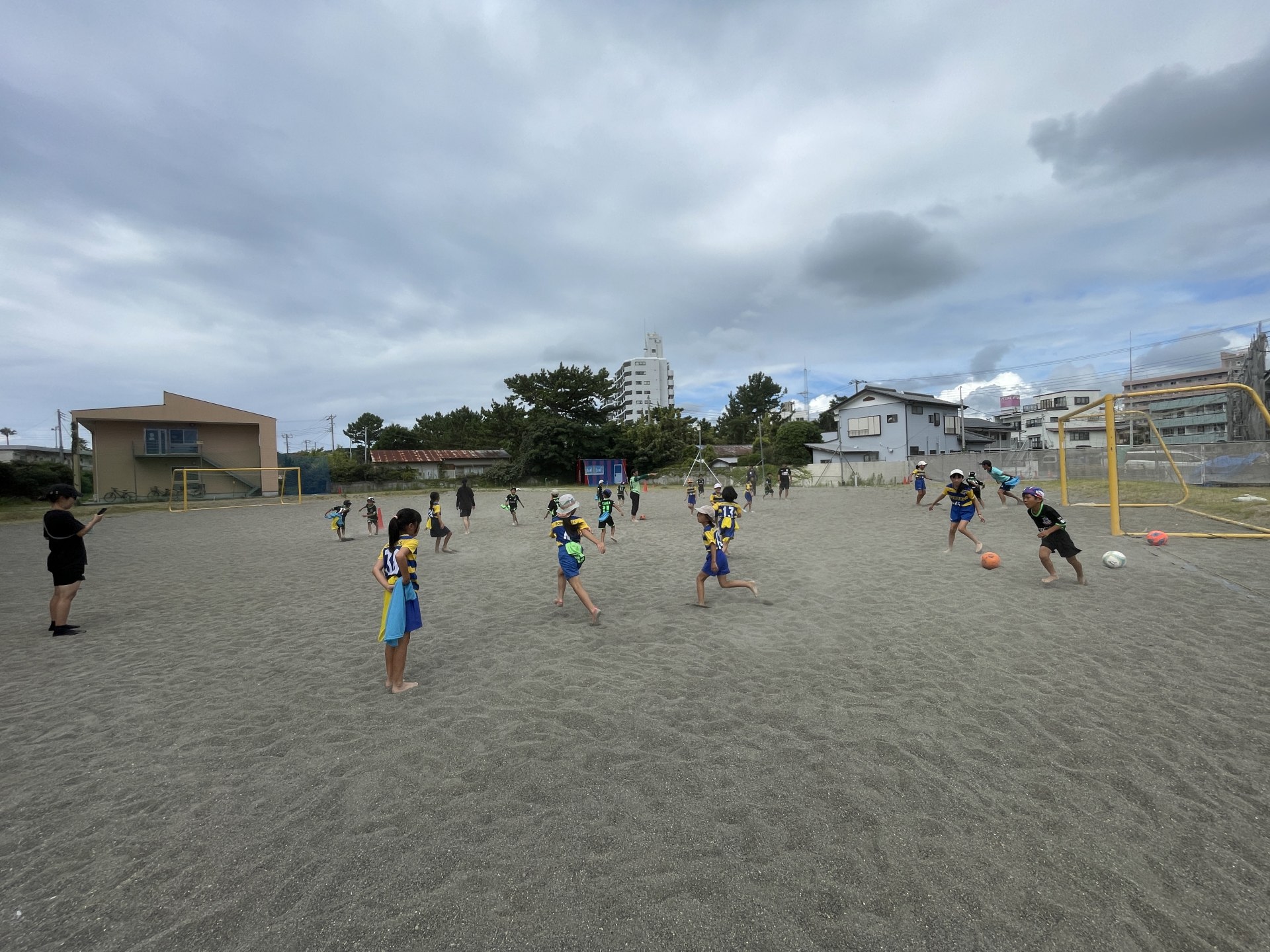 続いて、鴨川令徳ビーチコートに移動し、昨日に続き、今日はオルカなでしこビーチサッカースクール、TAKAサッカースクールの子どもたちが参加してのビーチサッカー体験会。