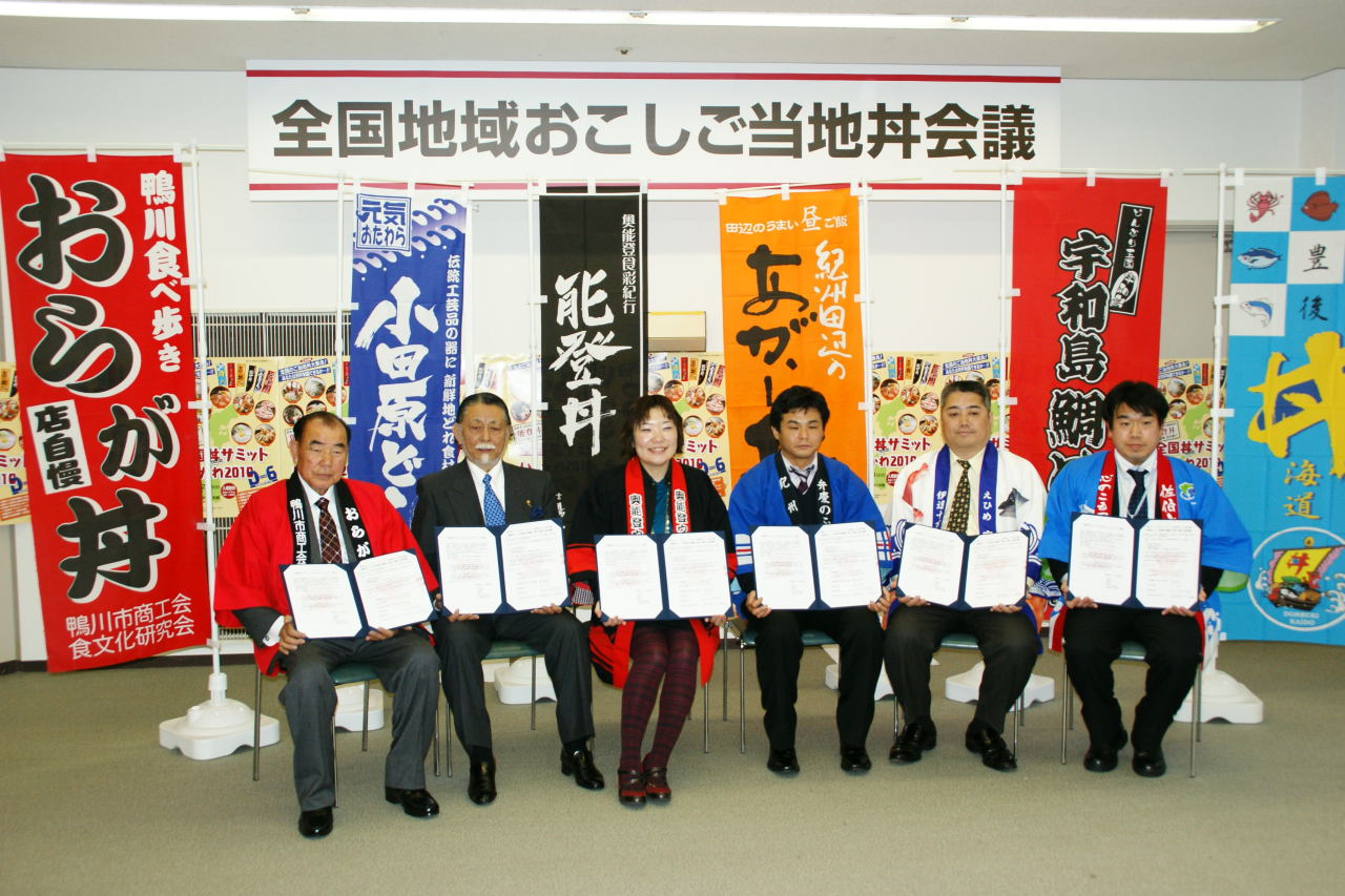 [写真:丼サミットでの調印式。一番左が高橋会長(2009年1月)