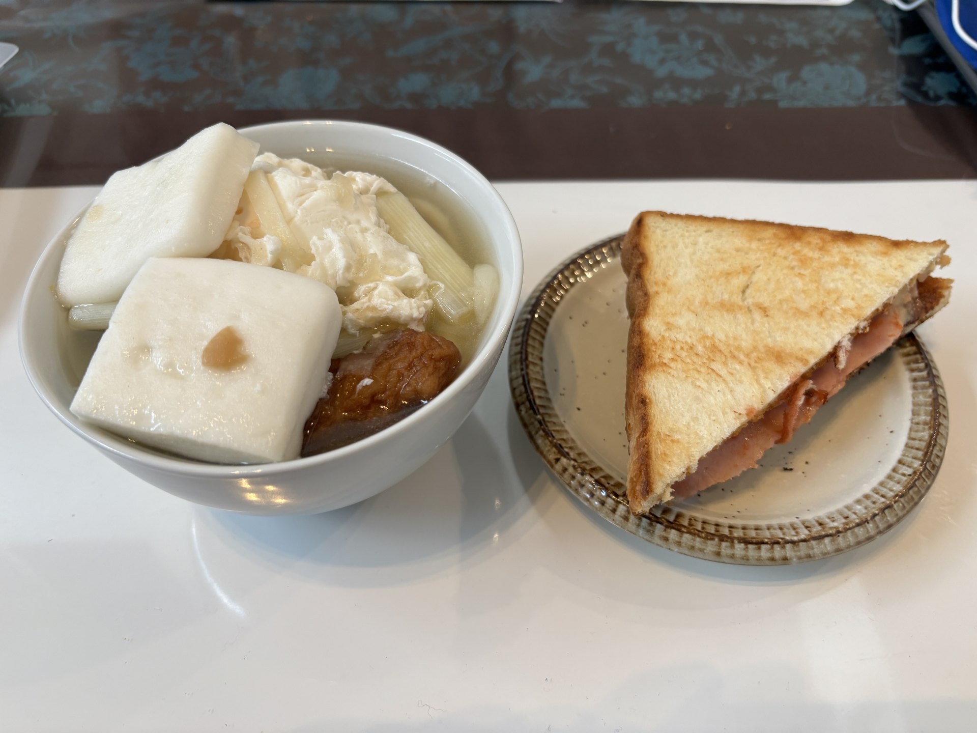 [写真:おでんうどんに、ベーコンチーズサンド。なかなか朝飯。笑