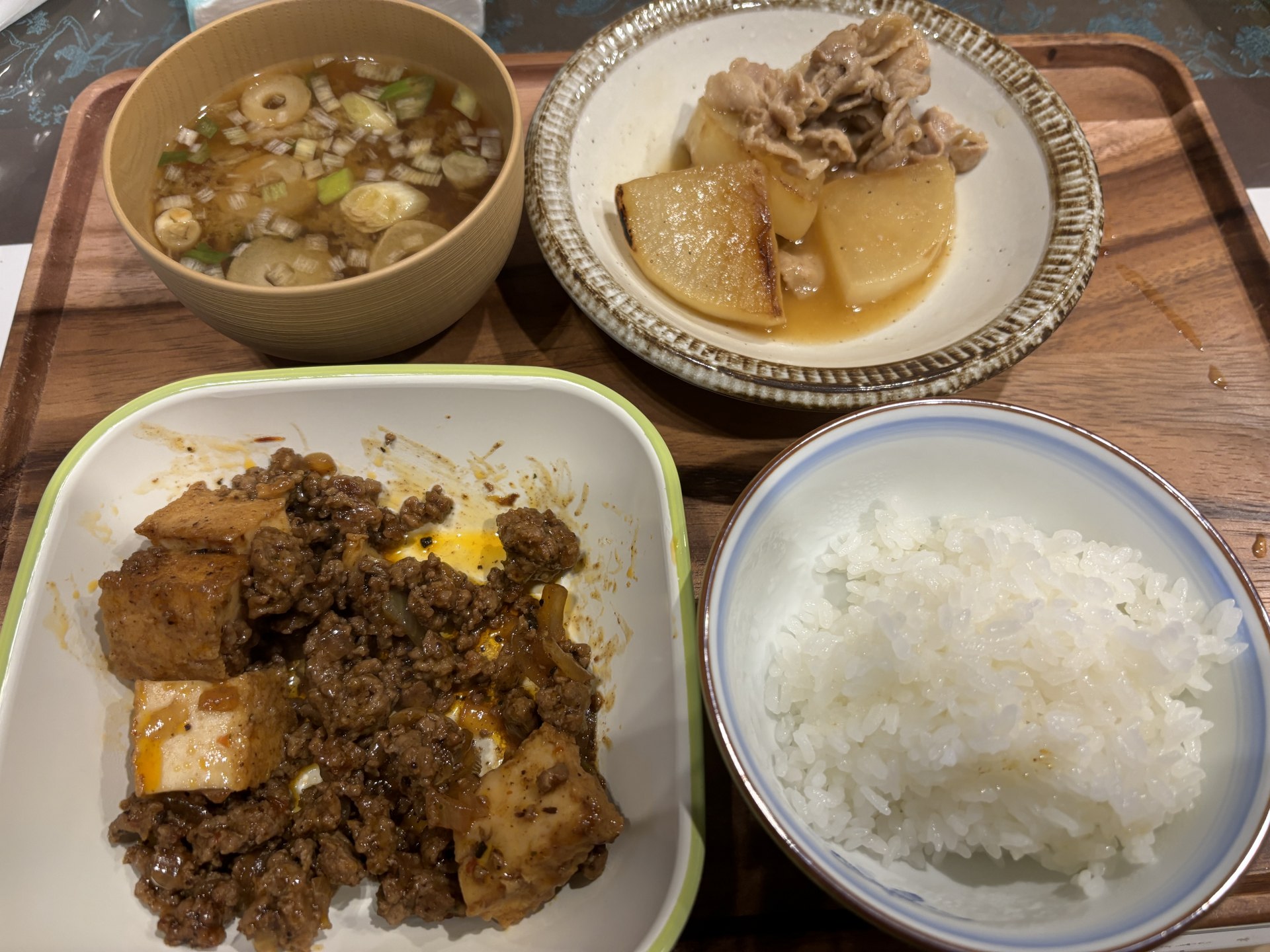 冷蔵庫の残り物などを見つつ、四川風麻婆豆腐と大根のすき焼き風煮をつくってみた。