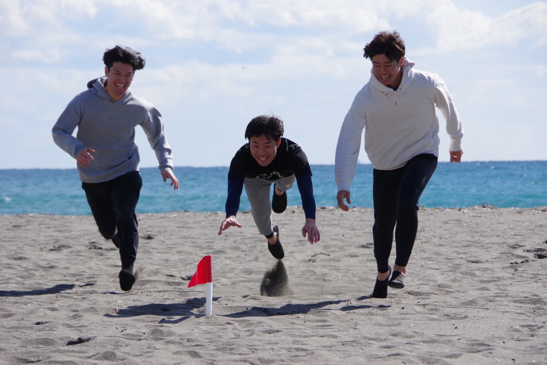 運搬後、二タ間海岸にてビーチアクティビティ・プログラムの撮影を行った。