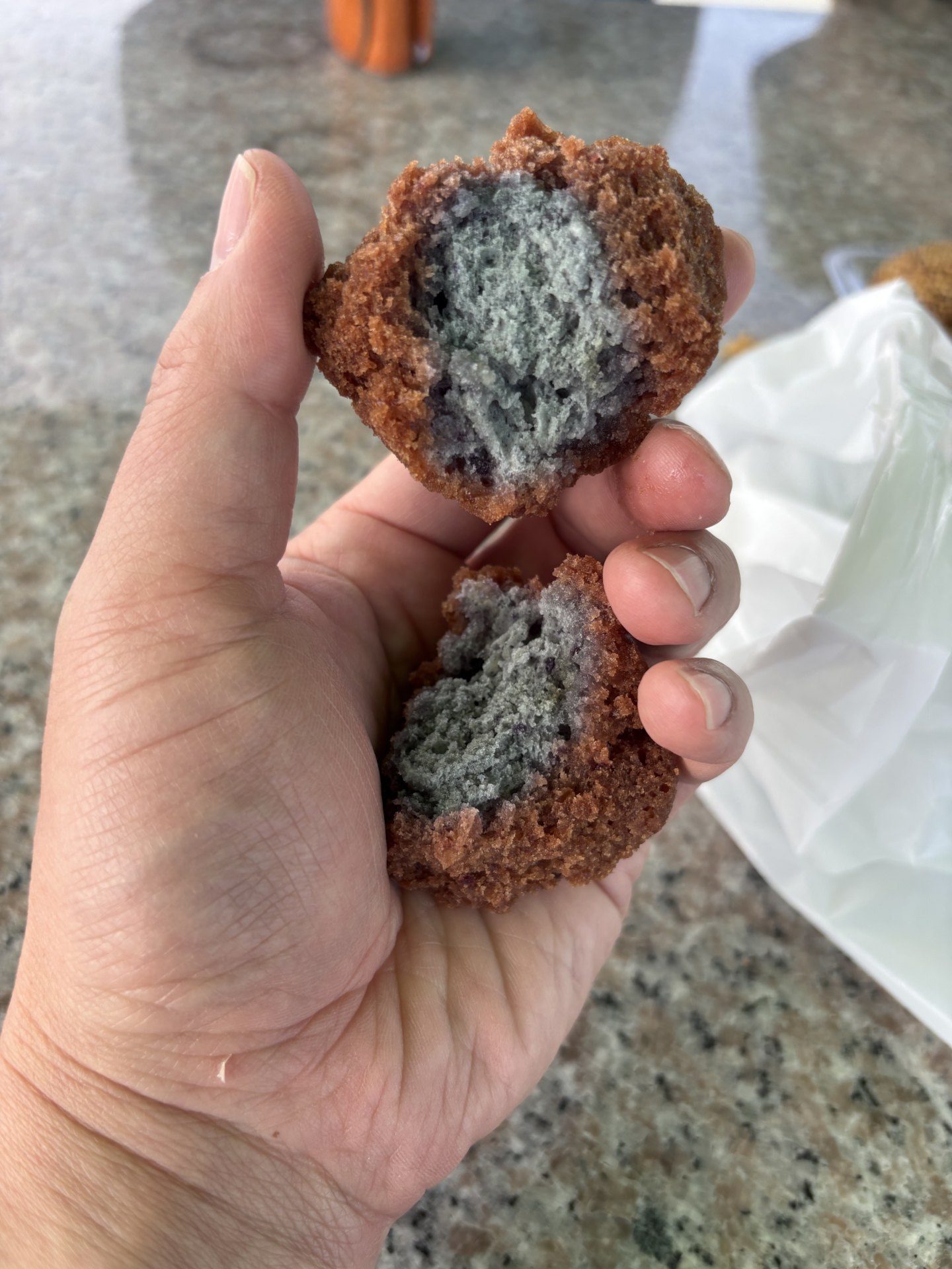 池間大橋を渡り、橋のたもとにあるお店で名物の紅芋パンピンと紅芋餅を食す。