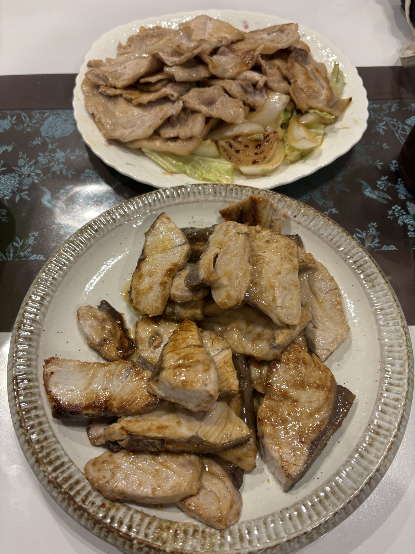 薄切り豚ロース肉を塩コショウで焼いたり、イナダをバターでムニエルにしたり、キャベツとたまねぎを炒めたり…。