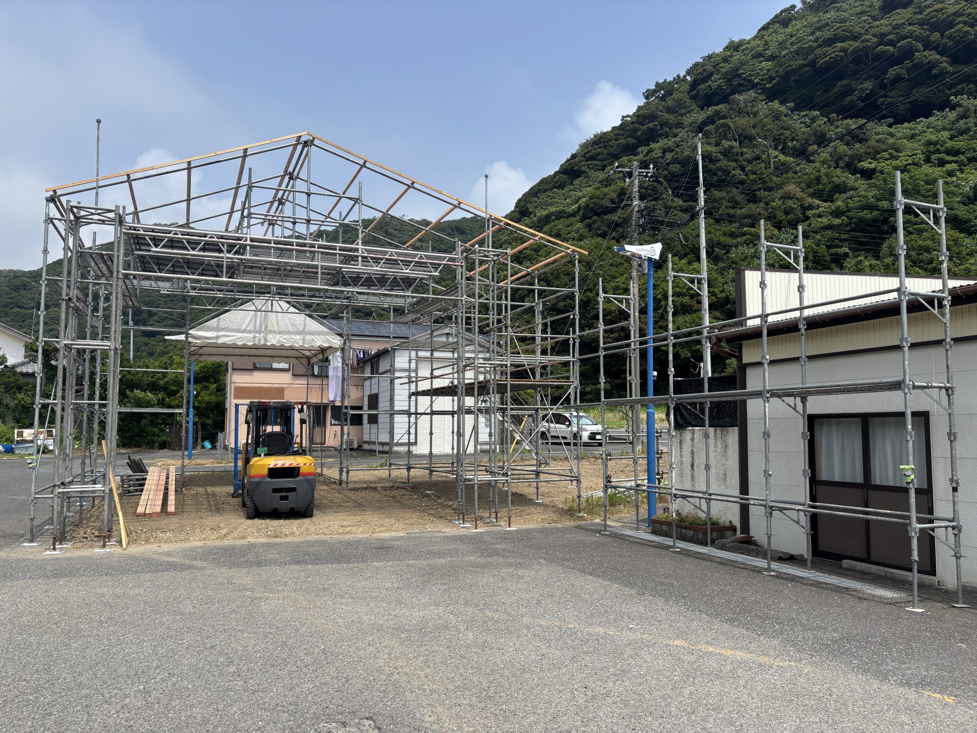[写真:安房天津駅前には、年番町の芝町により、今月末の祭礼に向け早くも御仮屋づくりが始まっていた。