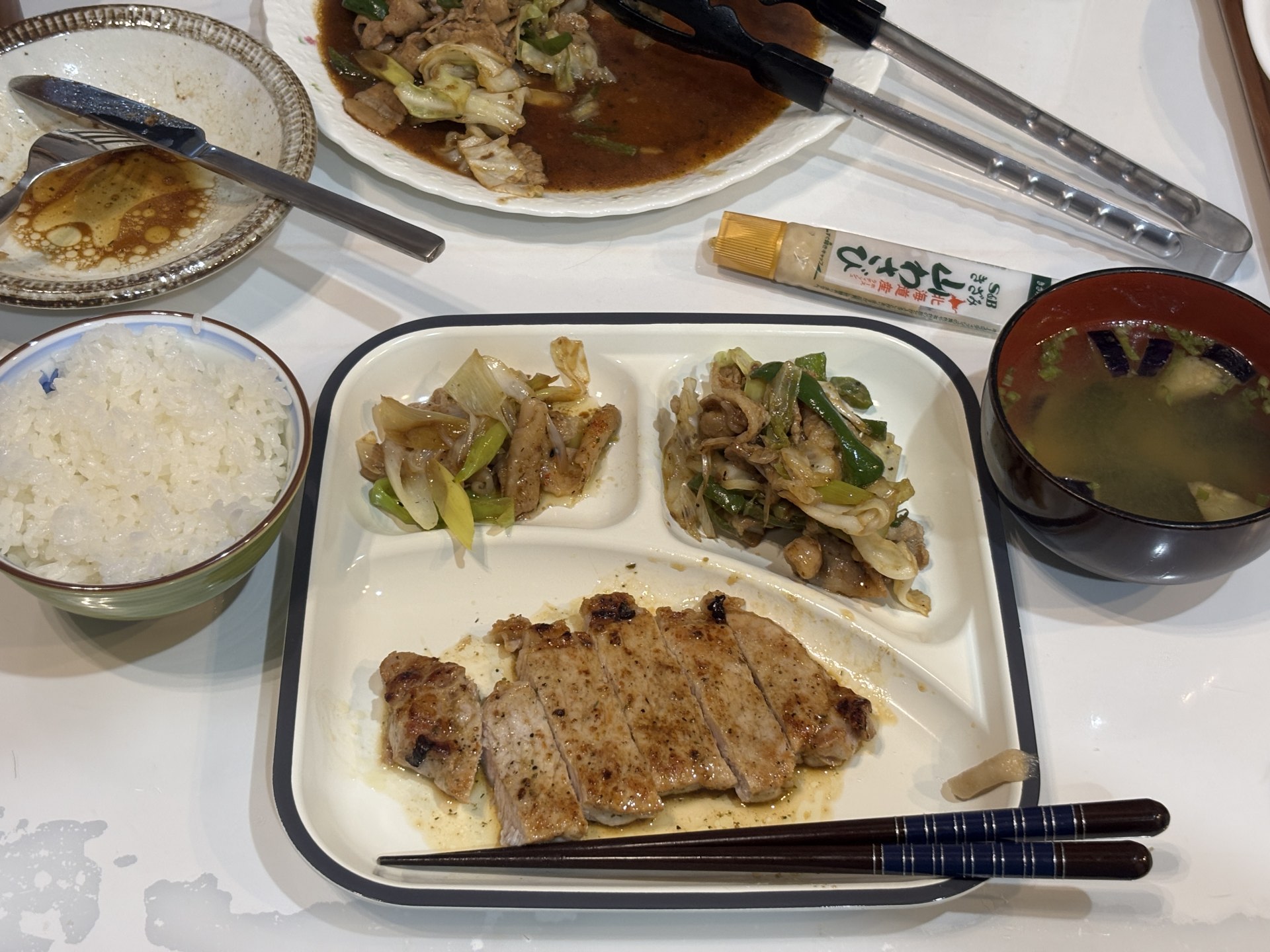 豚肉のソテーに、冷蔵庫にあったキャベツの余りを使って回鍋肉、さらに鶏皮焼きのネギポン酢和え。